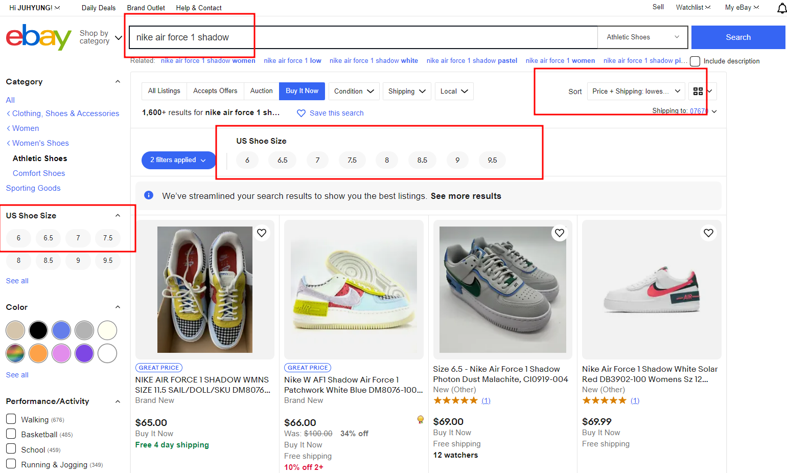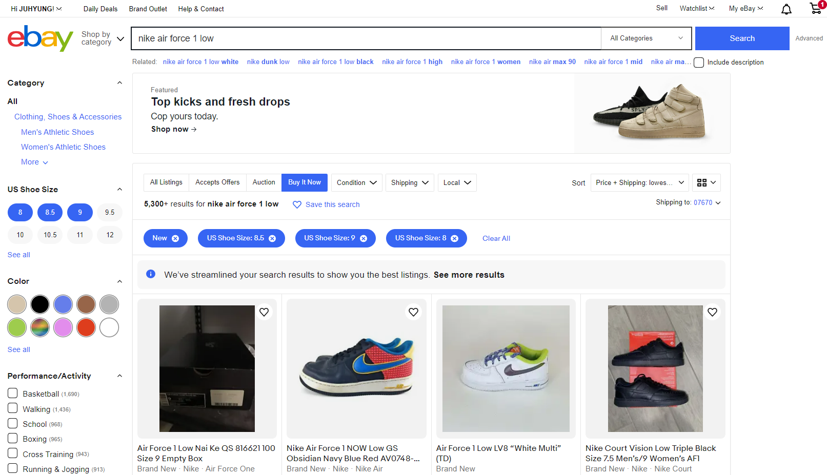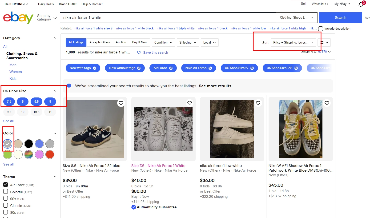 아래 이미지는 이베이에서 나이키 에어포스 1 07로 검색한 화면을 예시로 첨부한 것입니다.