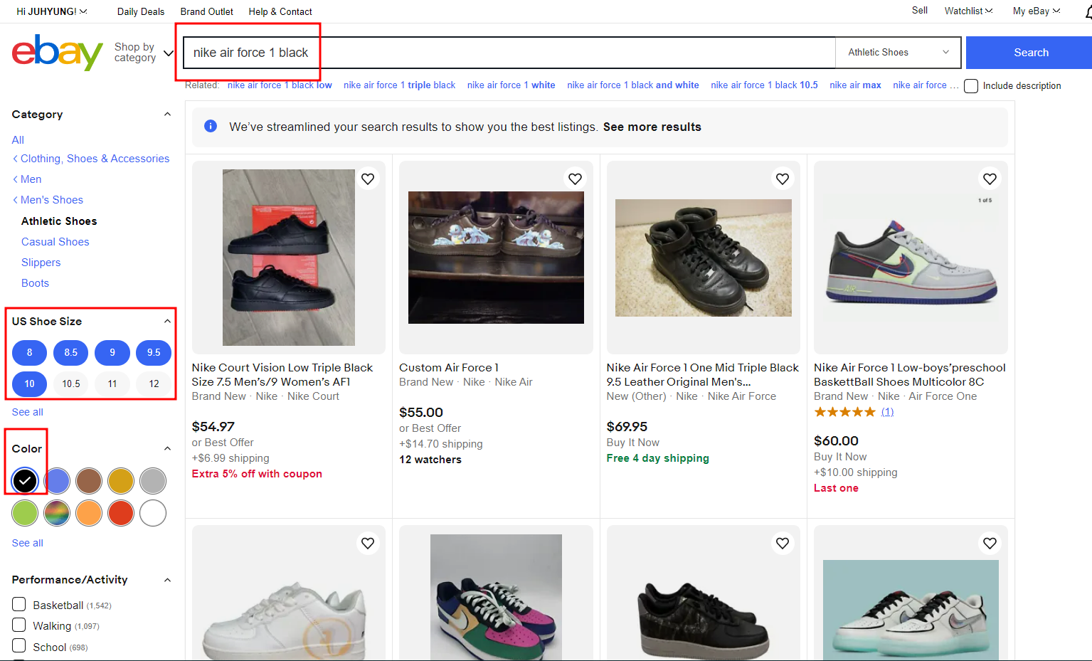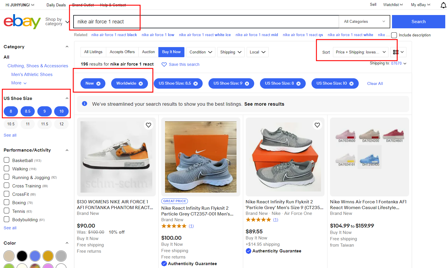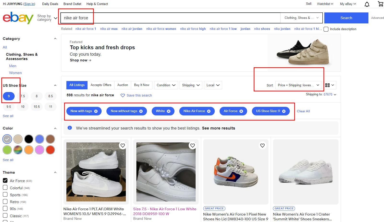 아래 이미지는 이베이에서 나이키 에어포스 1 07로 검색한 화면을 예시로 첨부한 것입니다.